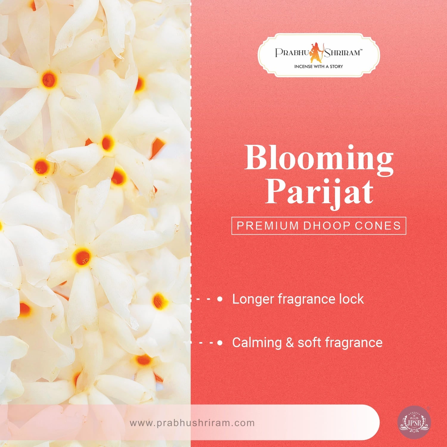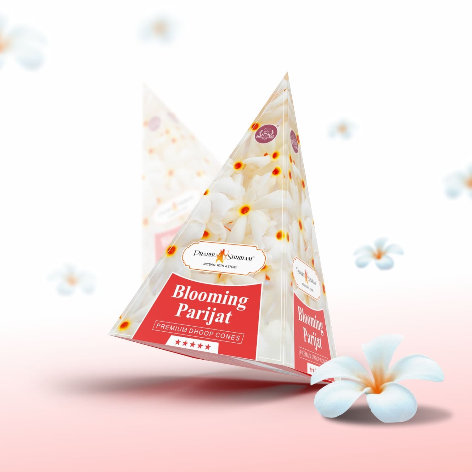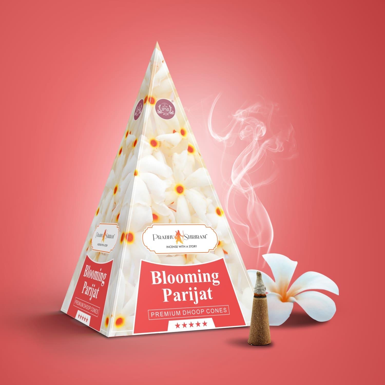 INCENSE STORY- Breathe in the Magic of the "Tree from Heaven" with Prabhu Shriram Incense with a story Blooming Parijat Premium Incense Cones.? Immerse yourself in the enchanting aroma of Blooming Parijat, also known as "Queen of the Night," "Har Singhar," or "Jasmine Flower." Each cone releases a garden of aromas, transforming your space into a haven of divine blossoms. Parijat is more than just a beautiful flower; it's a "tree from heaven" celebrated in worship, especially for Maa Durga. Prabhu Shriram Blooming Parijat Premium Incense Cones elevate your Incense experience beyond mere fragrance. They offer a unique blend of celestial aroma, rich tradition, and potential Ayurvedic benefits. This Pack comes in a monthly pack of 30 Blooming Parijat Premium Incense Cones.