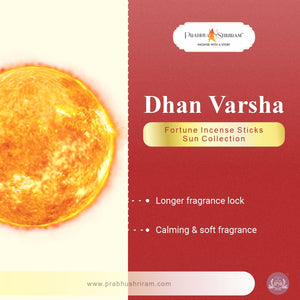 Incense Story: Unleash Prosperity with Dhan Varsha Sun: Your Morning Ritual for Abundance Start your day by attracting wealth and good fortune with the Dhan Varsha Sun Collection by JPSR from the house of Prabhu Shriram. This exquisite incense blend infuses your daily morning prayers with the power of sacred fragrance. How Dhan Varsha Sun Works: