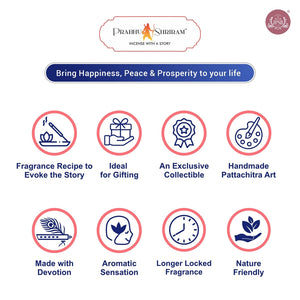 The Shri Krishna Leela Luxury Incense Collection brings these sacred milestones to life, transforming each story into a sensory journey. Each of the ten exquisite fragrances captures a defining chapter of Krishna’s life, celebrating his divinity, love, and playful spirit. Every incense is accompanied by a beautifully illustrated Pattachitra panel, an ancient art form from Odisha that spans over 1,000 years, connecting the past with the present.
