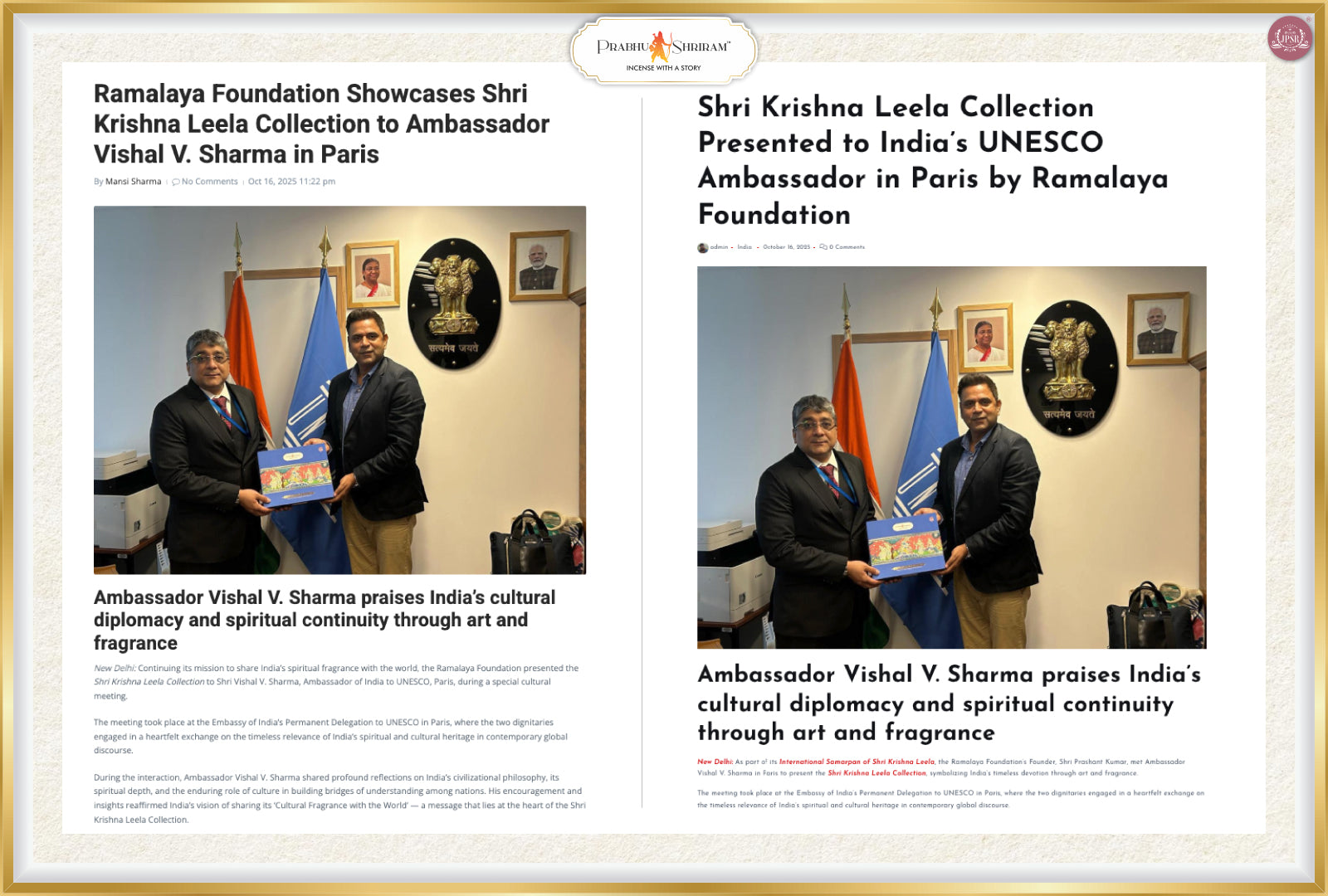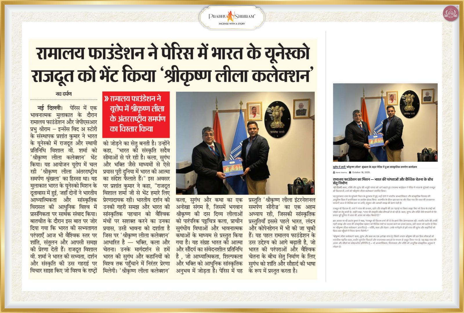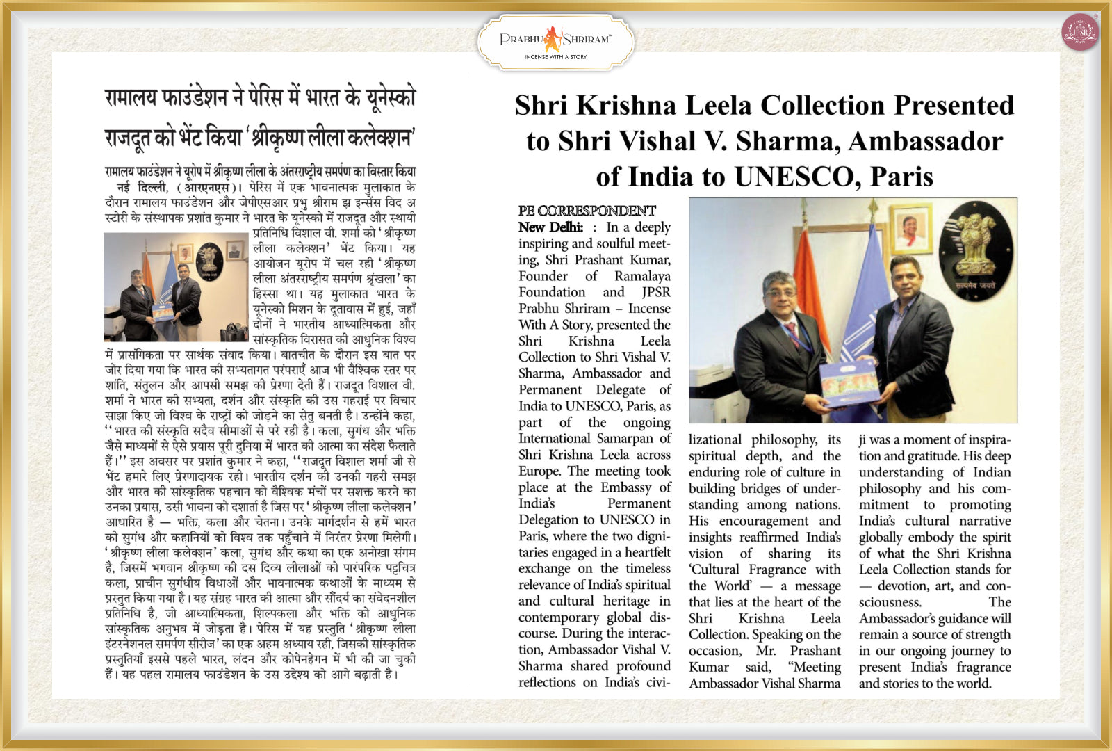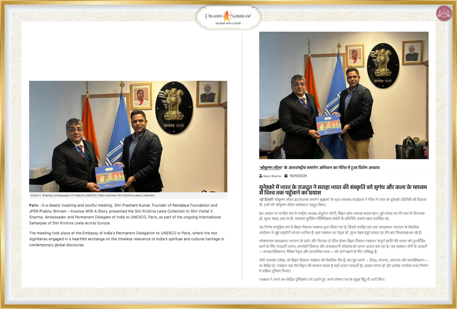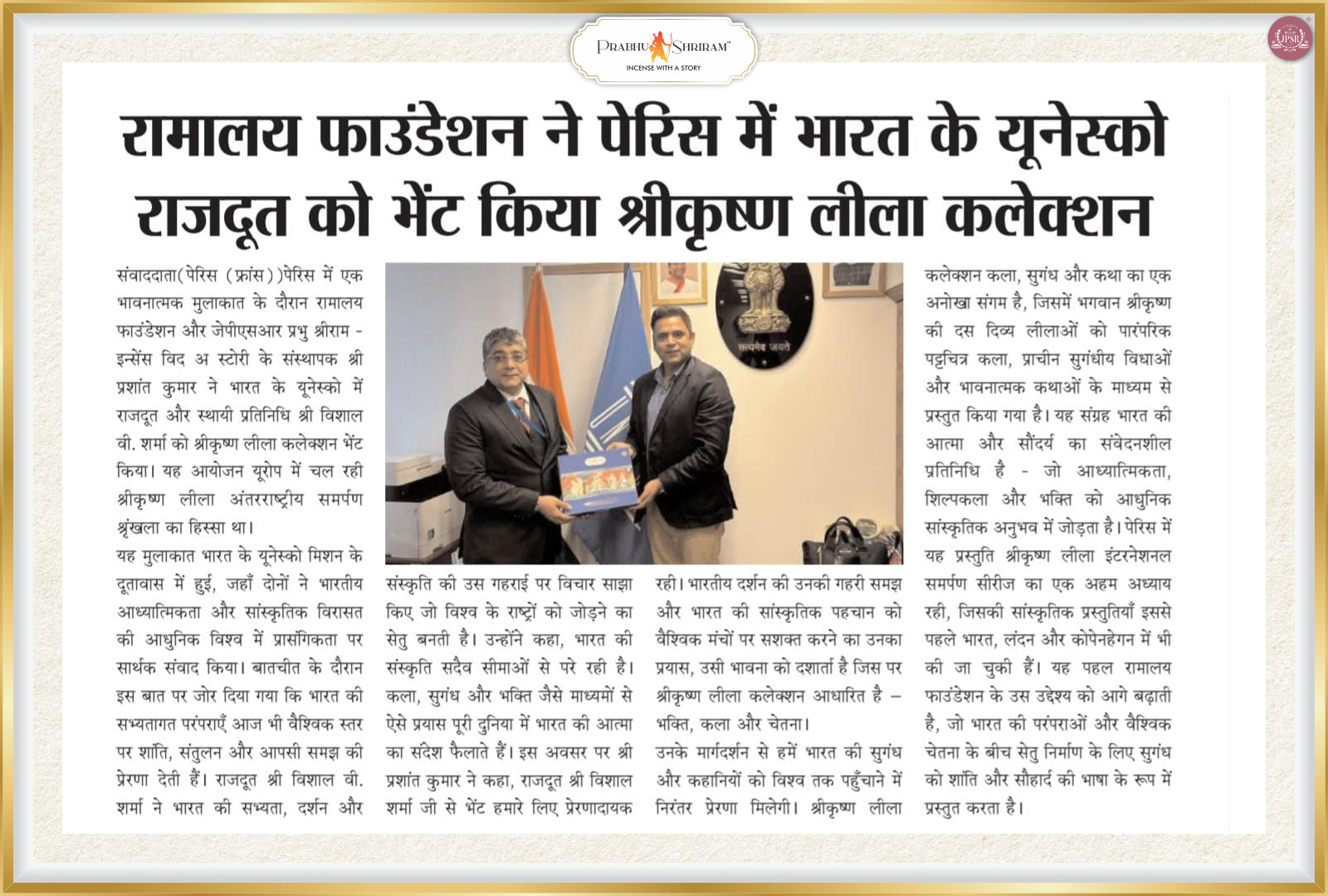 The International Samarpan of the Shri Krishna Leela Collection in Paris marked a spiritually enriching milestone in the global journey of JPSR Prabhu Shriram. The event beautifully blended art, devotion, and Indian cultural heritage, bringing together the Indian diaspora and admirers of Indian spirituality in a heartfelt celebration of Lord Krishna’s eternal stories.