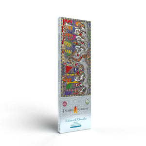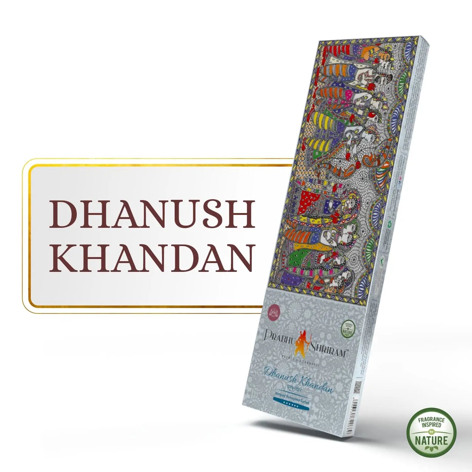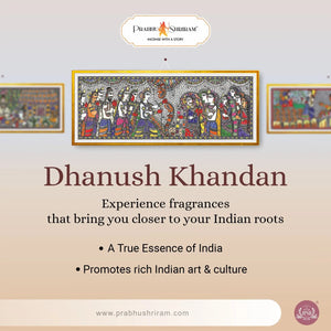 Shri Ramcharita Manas says that to lift the mighty Dhanush of Lord Shiva, love and not strength were required. Shri Ram was divine and full of love and that is why he was able to not only lift but also break the Dhanush. Dhanush Khandan from the Shripad Ramayana Series pack by PRABHU SHRIRAM PREMIUM AGARBATTI AND DHOOP is inspired by the Sita Swayamvar event from Ramayana. Adorned with beautiful Madhubani Paintings, the pack depicts the essence of the event. SPECIAL FEATURES: